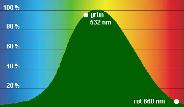 Das menschliche Auge nimmt verschiedene Farben unterschiedlich stark wahr. Rot befindet sich am Rand des Sehspektrums